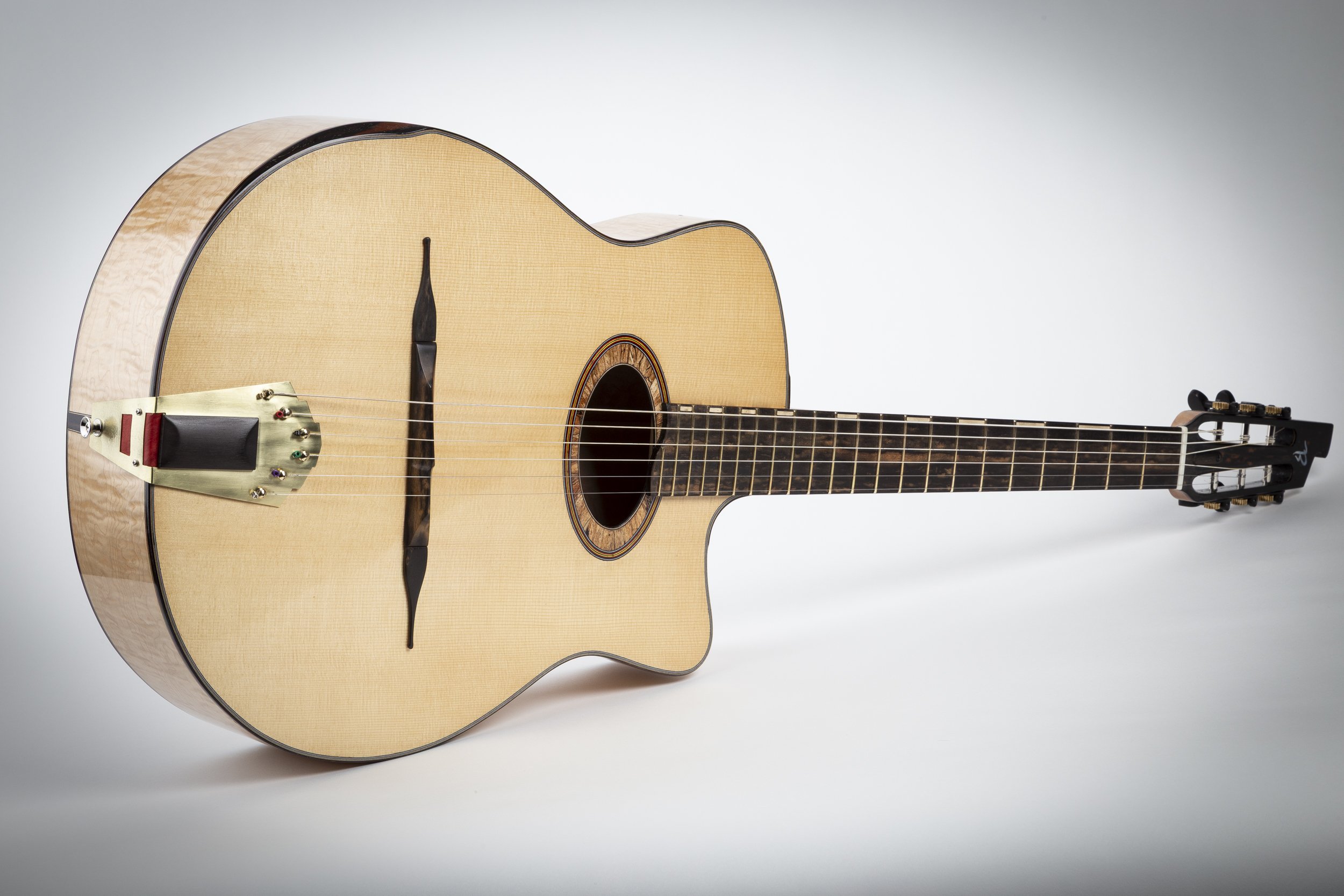 Top: red spruce with pilage; quilted bigleaf maple back; curly sugar maple sides, laminated with basswood and spanish cedar veneer